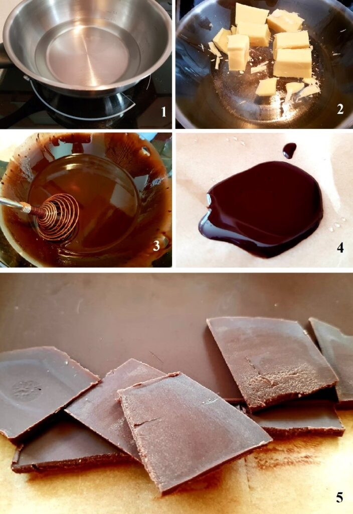 Alustasin katsetamisi tumedast šokolaadist, et saada aimu, millest kõik alguse saab. Sulatasin ühe paki ehk 80 grammi kakaovõid veevannis ja lisasin 40 grammi kakaod. Vedel šokolaad oli tume, kange ja mõru. Seejärel lisasin 20 grammi tuhksuhkrut ja tõstsin proovi koguse testimiseks. Lisasin veel 20 grammi tuhksuhkrut ja tõstsin taas proovi testimiseks. Ning lisasin siis veel kord 20 grammi suhkrut. Kuigi põhimass vähenes, siis üldjoontes jäi kolmanda katse retseptiks: