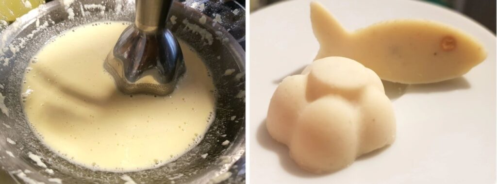 Taas sulatasin veevannis 80 grammi kakaovõid. Valge šokolaadi tavaline retsept on sada-sada-sada ehk 1:1:1 ehk kõiki koostisosi on võrdne kogus. Kui tavaliselt on retseptis 100 grammi kakaovõid, 100 grammi tuhksuhkrut ja 100 grammi piimapulbrit, siis minu kakaovõi pakk oli 80 grammine ja kaalusin välja ka 80 grammi suhkrut ja 80 grammi piimapulbrit. Kõik tundus väga hea kuni piimapulbri lisamiseni. Segu läks koheselt tükiliseks ja paksuks nagu pudel ja piimapulber ei tahtnud seguneda. Jätkasin segamist ja võtsime appi ka blenderi. Blender aitas ja segu muutus kreemisemaks ning hakkas meenutama palju enam seda läikivat segu, mis tekib valge šokolaadi sulatamisel. Küll aga jäi segu endiselt veidi jahuseks piimapulbri kareduse tõttu, mida me ka üle jahvatades piisavalt peeneks ei saanud. Tahke jahtunud valge šokolaadi puhul on see jahune tunne õnneks veidi vähem tuntav. Lisan siia ka pildi sellest, milline nägi mu valge šokolaad enne blenderdamist välja ja kui ilusad tulid sellest lõpuks ikkagi kommid välja.