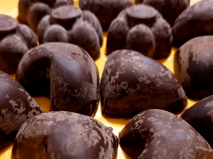 Pildil on valmis vormidest välja võetud kommid. Otse külmkapist võttes on neid väga raske hammustada. Esiteks on nad natuke liiga suured. Kui nad on mõni minut toas soojas olnud, siis muutuvad nad veidi pehmemaks ja siis ei ole neid raske hammustada.